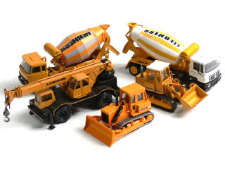 miniatures reproduisant les modèles : MAN, LIEBHERR (un véhicule avec petites retouches & fixations non d'origine) & MAGIRUS (colonne de transmission incomplète) - on y retrouve les marques SIKU & CONRAD