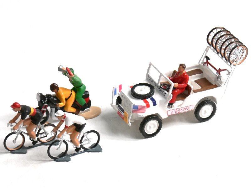 C.B.G. (FRANCE) Ensemble de 2 coureurs cyclistes, un motard avec passager & une JEEP porte-vélo