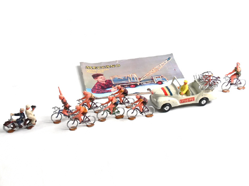 publicités 'L'EQUIPE' - avec conducteur & 3 vélos - manque un fanion - on y joint 7 coureurs cyclistes, un motard avec passager (manques de peinture) & un catalogue général MECCANO de 1956