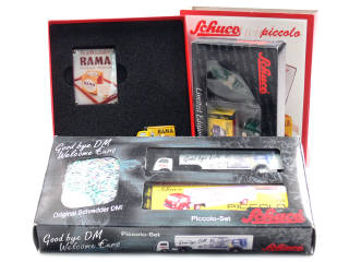 série PICCOLO - contient : TEMPO, plaque publicitaire & certificat d'édition limitée à 2222 exemplaires - on y joint un coffret 'GOOD BYE DEUTCHMARK' avec MERCEDES camion semi-remorque, boîte, billet de banque découpé sous sachet & certificat d'édition limitée à 2222 exemplaires & un coffret 'AFTER EIGHT' avec VOLKSWAGEN BULLI, boîte & épinglette