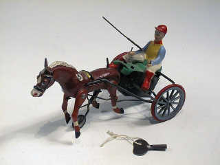 JOUET MECANIQUE Cheval avec sulky & jockey polychrome