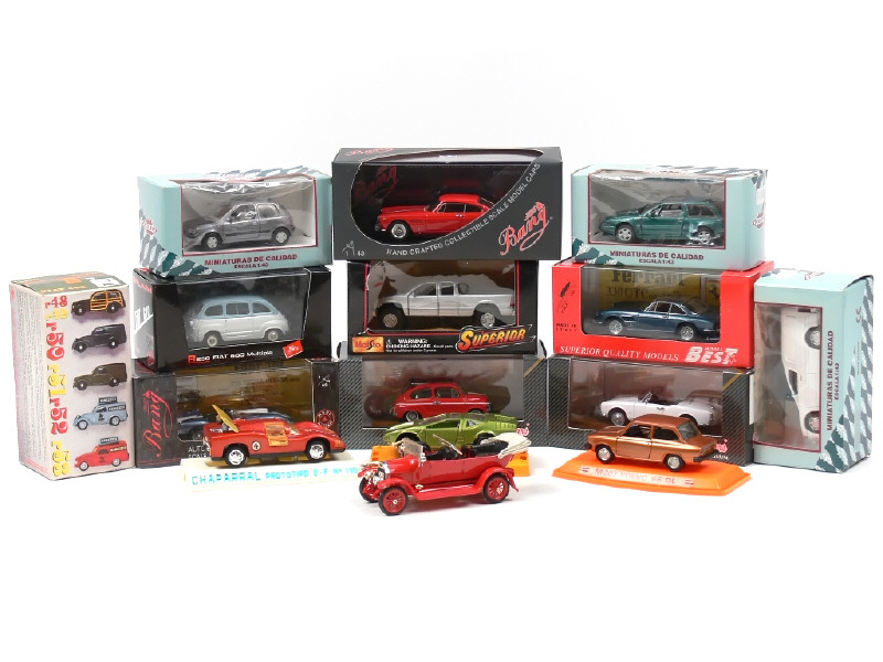 miniatures reproduisant les modèles : FERRARI, FIAT, NISSAN, VOLVO, ALFA ROMEO, ITALA, CHAPARRAL, FORD, CHEVROLET, SUZUKI, BMW, DODGE, RENAULT, MASERATI, SEAT & ABARTH - on y retrouve notamment les marques : MEBETOYS, BBURAGO, BRUMM, BANG, DUGU, DETAIL CARS, JOAL, MAISTO, POLISTIL & PILEN - on y joint une boîte vide - une boîte en état 'd' & 6 en état 'c'
