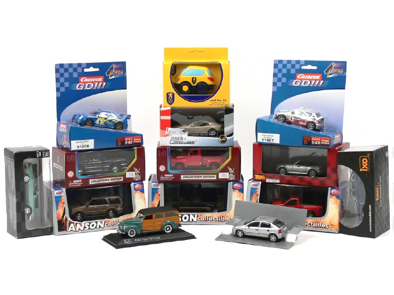 miniatures reproduisant les modèles : ASTON MARTIN, BMW, FORD, CHEVROLET, JAGUAR, OPEL, PEUGEOT, MERCEDES & SUBARU - on y retrouve notamment les marques : ANSON, ROAD LEGEND, NEWRAY, IXO, CARARAMA, NOREV & MINICHAMPS - 3 boîtes en état 'c'