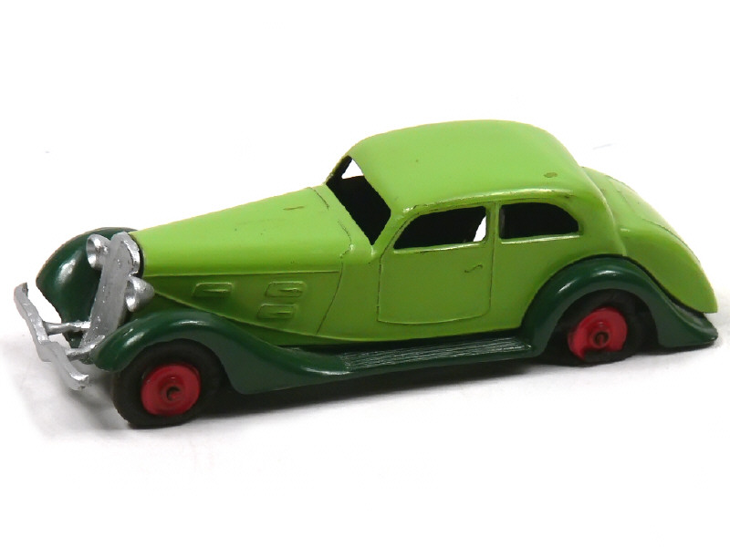 jantes rouges - modèle en plomb produit en 1935 - traces d'oxydation sur la lamelle de suspension - ensemble calandre-phares-pare-chocs non d'origine - pneus fondus - une fêlure à l'arrière du marchepied droit