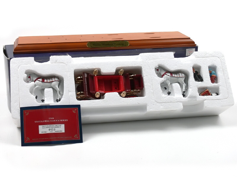 contient : un socle de présentation en bois, le carrosse royal, 4 chevaux, 4 valets, le Prince Charles & la Reine Mère - avec certificat d'édition limitée numéroté 4619/5000 exemplaires