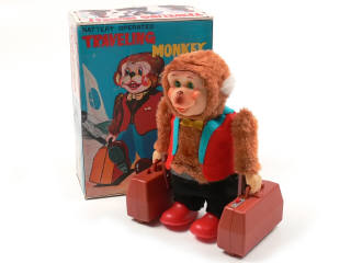 hauteur : 22 cm - système à piles (fonctionne) - en action, le singe avance en traînant ses valises - pantalon décollé