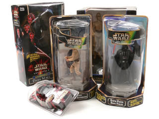 comprend : LUKE SKYWALKER, DARK VADOR, DARK MAUL, R2D2 & SISPEO - mécanismes à piles non testés - avec manques - on y joint une montre