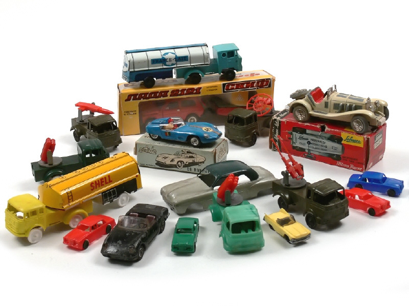 états de 'B' à 'R' - miniatures reproduisant les modèles : BERLIET, BERNARD, LOTUS, MERCEDES, CADILLAC, PANHARD (détails de peinture ajoutés), LADA (traces de métal fatigue sur l'ensemble de la carrosserie) & RENAULT - on y retrouve notamment les marques : SOLIDO, SESAME, CORGI TOYS & SCHUCO (moteur à clef fonctionne) - avec manques - 3 voitures en boîte (état 'c')