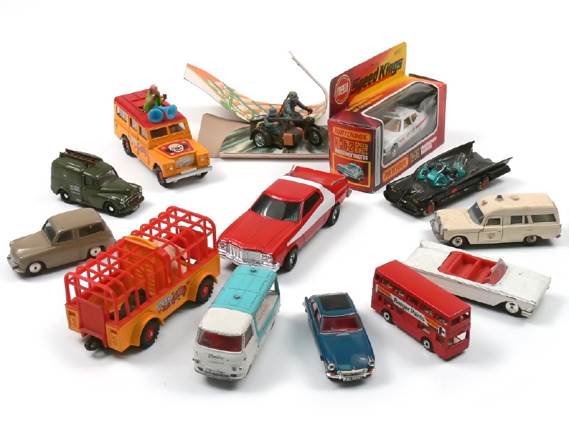 états de 'A' à 'E' - miniatures reproduisant notamment les modèles : MERCEDES, CITROEN, FORD, HILLMAN, MG, COMMER, MORRIS, LAND ROVER & BATMOBILE (pneus non d'origine) - on y retrouve les marques : CORGI TOYS, DINKY MATCHBOX, LONE STAR (pare-brise incomplet), MATCHBOX (un modèle avec boîte) & BRITAINS - quelques petits manques
