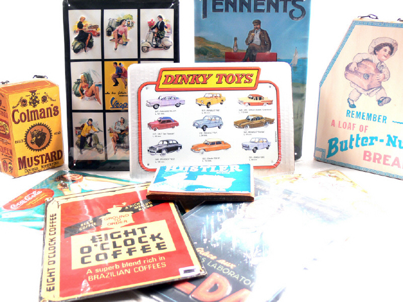 reproductions - on y retrouve les publicités : COCA COLA, BONDUEL, VALDA, TENNENT'S, VESPA & DINKY TOYS - on y joint une plaque émaillée 'HEIGHT O'CLOCK COFFEE' & 3 plaques en bois 'HUSTLER, COLSMAN'S MUSTARD, BUTTER-NUT'