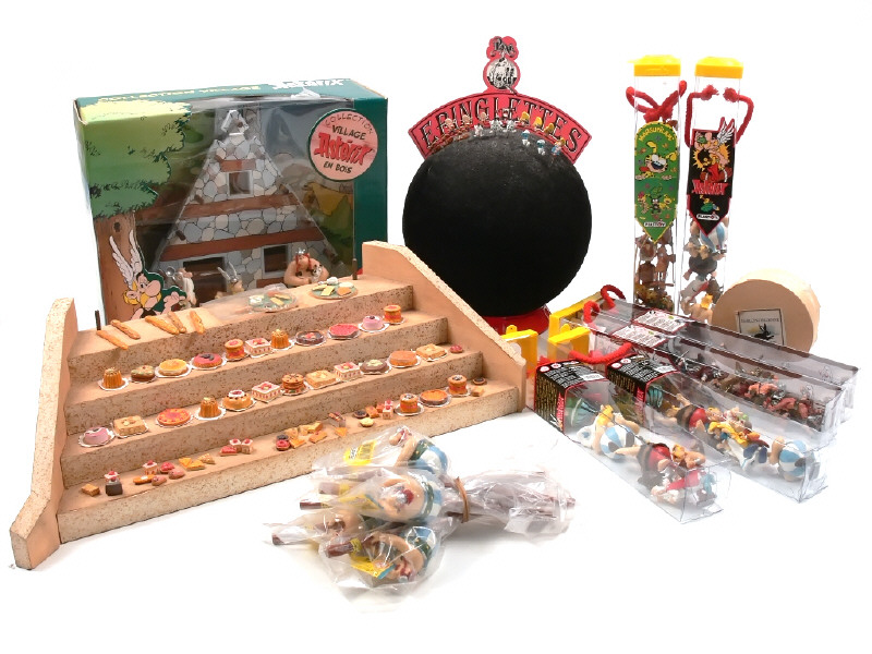 comprend : un présentoir de 58 patisseries, 2 plateaux de fromage, 5 baguettes & un autre de 18 épinglettes représentant : les SCHTROUMPF, Raymonde BIDOCHON, GIBBIE, SPIP, GROS MINET, SAM le pirate, TAZ & SPEEDY GONZALES - on y joint 5 crayons OBELIX, le petit SPIROU, 6 tubes contenant 10 figurines sur les thèmes ASTERIX, GLADIATEUR & MARSUPILAMI & la maison d'ASTERIX - on y retrouve les marques : PIXI, LEBLON-DELIENNE & PLASTOY