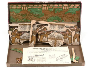 fabrication en carton des années 1930 - comprend différentes pièces permettant de monter une tranchée & 8 soldats de 2 types différents - éléments jamais assemblés d'origine - avec notice