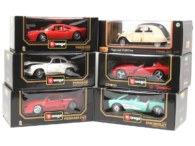 échelle 1/18ème - comprend : CITROËN 2 CV (de marque MAISTO), CHEVROLET CORVETTE 1957, DODGE VIPER 1992, FERRARI GTO 1984, FERRARI F40 1987 & PORSCHE 356B coupé 1962