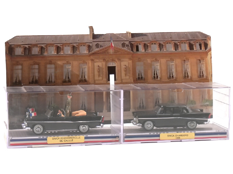 comprend : SIMCA CHAMBORD cabriolet du général de Gaulle & SIMCA CHAMBORD d'escorte 1958 - avec catalogues-dépliants - manque une petite partie du diorama cartonné