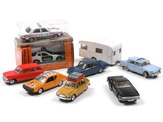 états de 'A' à 'D' - miniatures reproduisant les modèles : PEUGEOT, CITROEN, RENAULT, SIMCA, MONTEVERDI, PORSCHE & DIGUE - petits manques - quelques carrosseries légèrement déformées - 2 véhicules avec boîte