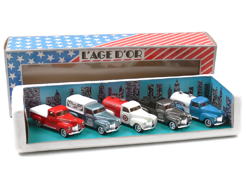 contient : pick-up pompiers, pick-up bâché 'FLOWER SHOP', citerne 'TEXACO', citerne à lait & un plateau-charbonier - blister de boîte décollé