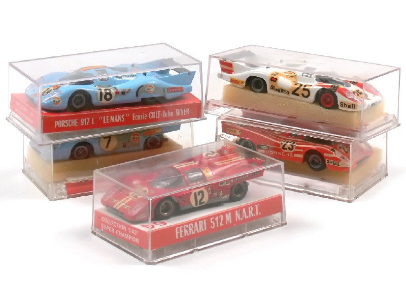 comprend : PORSCHE 917 (2 exemplaires différents dont un avec boîte en état 'c'), PORSCHE 917 L (2 exemplaires différents) & FERRARI 512 M