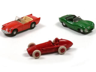 miniatures reproduisant les modèles : DAIMLER (état 'D'), JAGUAR & FERRARI (plancher déformé & cassé, pneus non d'origine) - on y retrouve les marques CRESCENT TOY & SPOT ON