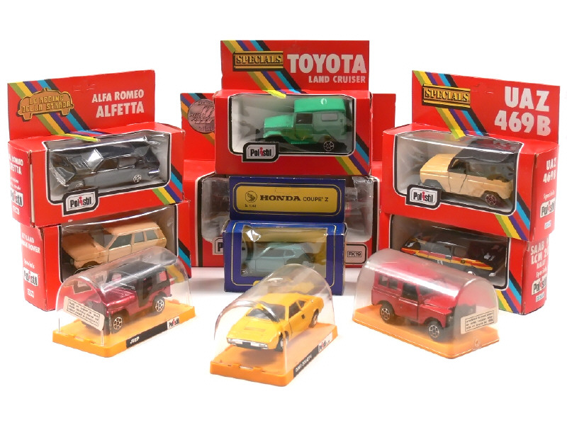 miniatures reproduisant les modèles : HONDA, TOYOTA, ALFA ROMEO, UAZ, LAND ROVER, JEEP, FERRARI (2 exemplaires différents), LEYLAND & SAAB - 2 boîtes en état 'c'