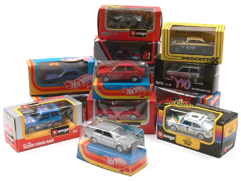 miniatures reproduisant les modèles : VOLVO (2 exemplaires) , ALFA ROMEO, LANCIA, FERRARI (4 exemplaires différents), BRABHAM, SUZUKI, MERCEDES (2 exemplaires différents) & SAAB - on y retrouve les marques : BBURAGO, YAXON, POLISTIL, MATEL & PROGETTO K - 2 boîtes en état 'c'