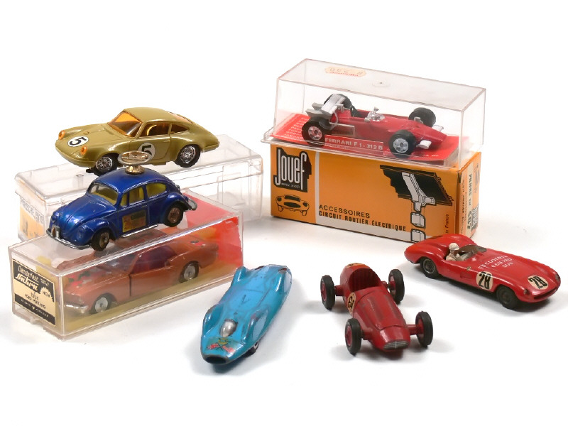 états de 'A' à 'R' - miniatures reproduisant les modèles : PORSCHE, FERRARI (2 exemplaires différents), MASERATI, BLUE BIRD, VOLKSWAGEN & FORD - on y retrouve les marques : CORGI TOYS, GAMDA KOOR, MERCURY, TEKNO, MINIALUXE (véhicule de circuit électrique) & JOUEF (avec boîte d'accessoires routiers, semble complète) - quelques petits manques - 3 véhicules en boîte