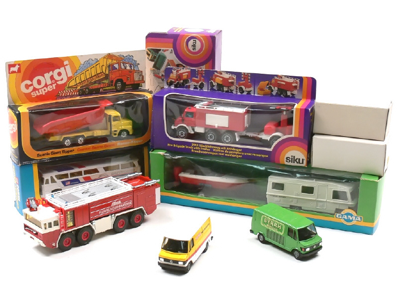 miniatures reproduisant les modèles : HIMER, MERCEDES (3 exemplaires différents dont 2 promotionnels), AMERICRUISER, SCANIA & METZ FAUN - on y retrouve les marques : CORGI TOYS, SIKU, GAMA & CONRAD - une boîte en état 'c'