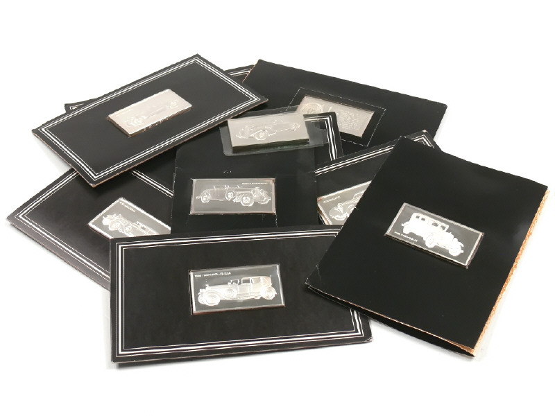 collection 'CENT ANS D'HISTOIRE DE L'AUTOMOBILE' (100 lingots édités à 1000 exemplaires chacun) - représente les véhicules suivants avec leur historique gravé au verso : HISPANO-SUIZA 1930, CADILLAC 1931; CHEVROLET 1929, DUESENBERG 1933, BUGATTI 1935, LINCOLN 1932, MAYBACH 1936, DELAHAYE 1937, STUTZ 1931 & CITROEN 1934