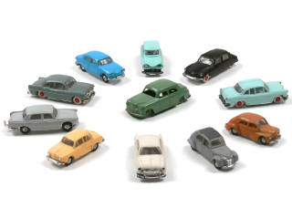 états de 'A' à 'C' - série MICRO MINIATURES - comprend : RENAULT 4CV (2 fêlures sur la carrosserie), DAUPHINE, SIMCA VERSAILLES (2 exemplaires dont un avec toit fendu), ARIANE, CITROEN DS 19, 2CV AZ, AMI 6 (modèle dériveté avec un phare manquant), PEUGEOT 404 & PANHARD PL17 - on y joint une FIAT 1400 en état 'D' de la marque MERCURY - 2 carrosseries légèrement décolorées