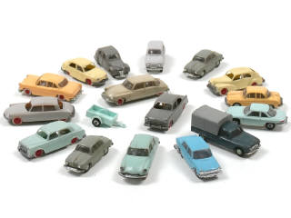 états de 'A' à 'C' - comprend : SIMCA 1500 (un rivet cassé), VERSAILLES (toit fêlé), RENAULT DAUPHINE (3 exemplaires dont un avec un montant de toit cassé), 4L, CITROEN DS 19 (un modèle avec toit fêlé & l'autre en état 'D'), 2CV AZ, PEUGEOT 403 T4Z & PANHARD 24CT - on y joint 5 voitures (PANHARD, PEUGEOT, CITROEN & SIMCA) de la marque JOUEF - 2 carrosseries légèrement décolorées