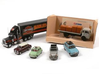 miniatures reproduisant les modèles : RENAULT, CITROEN, FIAT, WOLSELEY, SIMCA & PETERBILT - on y retrouve les marques : DINKY MATCHBOX & CORGI TOYS (avec certificat) - quelques petits détails de peinture ajoutés