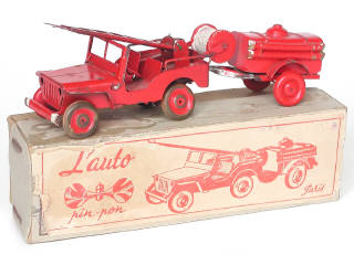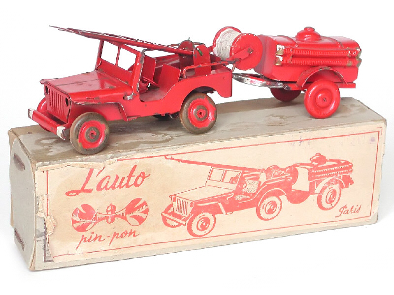 POLICHINELLE (FRANCE) JEEP WILLYS Pompiers avec échelle, dérouleur & remorque citerne rouge