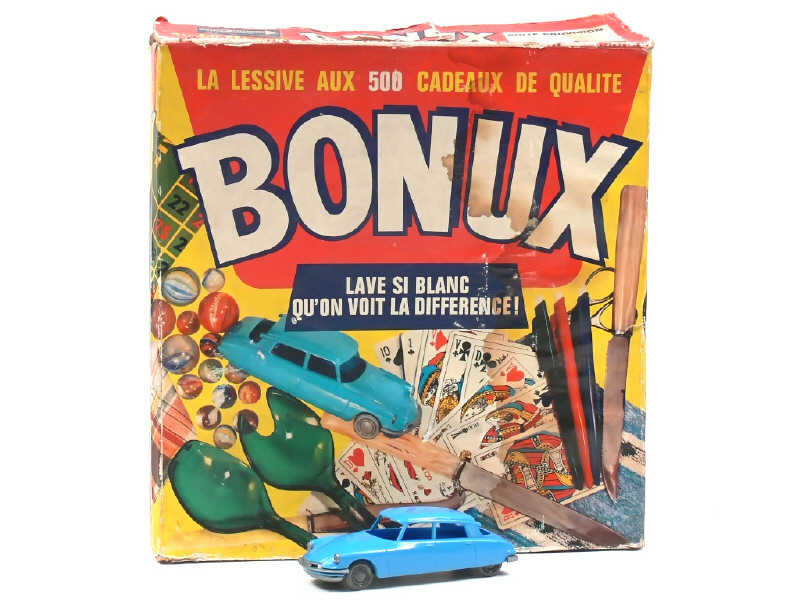 échelle 1/32ème - axes de roues oxydés - on y joint un paquet de lessive vide (boîte provision) de la marque BONUX (en état 'c') avec illustration du modèle proposé