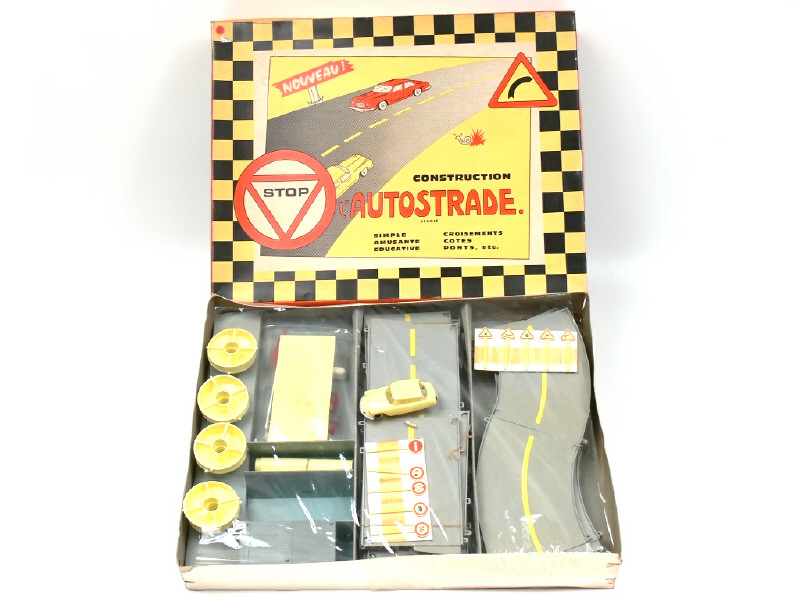 contient : CITROEN DS 19 (échelle 1/64ème avec une partie de pare-chocs arrière manquante), un box individuel, un bâtiment (sous sachet individuel jamais ouvert), 10 panneaux de signalisation répartis sur 2 cartons, différents éléments permettant la construction de routes & de ponts & une notice - calage de boîte présent - ensemble jamais utilisé sous film plastique en partie déchiré - très légère décoloration d'un côté de boîte - SUPERBE ENSEMBLE !