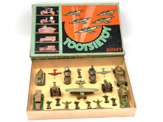 états de 'A' à 'D' - fabrication des années 30 - contient : une ambulance (un petit défaut de moulage sur une aile), un camion bâché, une automitrailleuse, MACK camion-plateau avec projecteur, MACK camion-plateau avec canon, 2 avions de chasse, 2 bombardiers, un char (chenilles séchées & déformées), 2 canons & 7 soldats (avec canons de fusils manquants) - cale de boîte présente - quelques traces d'oxydation sur certains axes de roues - SUPERBE ENSEMBLE DANS UN TRES BEL ETAT D'ORIGINE !
