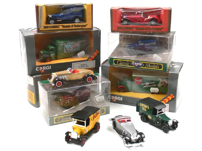 miniatures reproduisant les modèles : BEDFORD, FORD, TALBOT, RILEY, AUBURN & MERCEDES - on y retrouve les marques : CORGI TOYS & MATCHBOX MODELS OF YESTERYEAR - 4 véhicules sans boîte - une boîte en état 'c'
