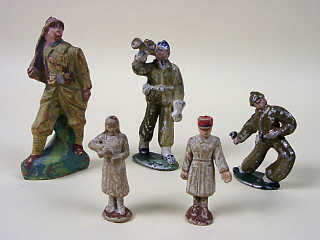 comprend : 2 personnages du service de santé en composition (fabrication vers 1930), 1 soldat français de la seconde guerre mondiale en terre cuite & 2 soldats américains en alu