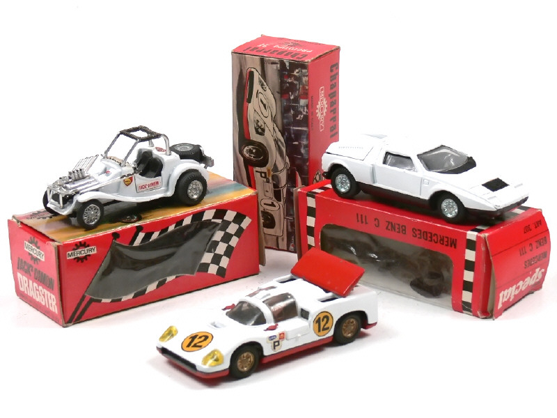 miniatures reproduisant notamment les modèles : CHAPARRAL (un décalque incomplet) & MERCEDES (petits manques)