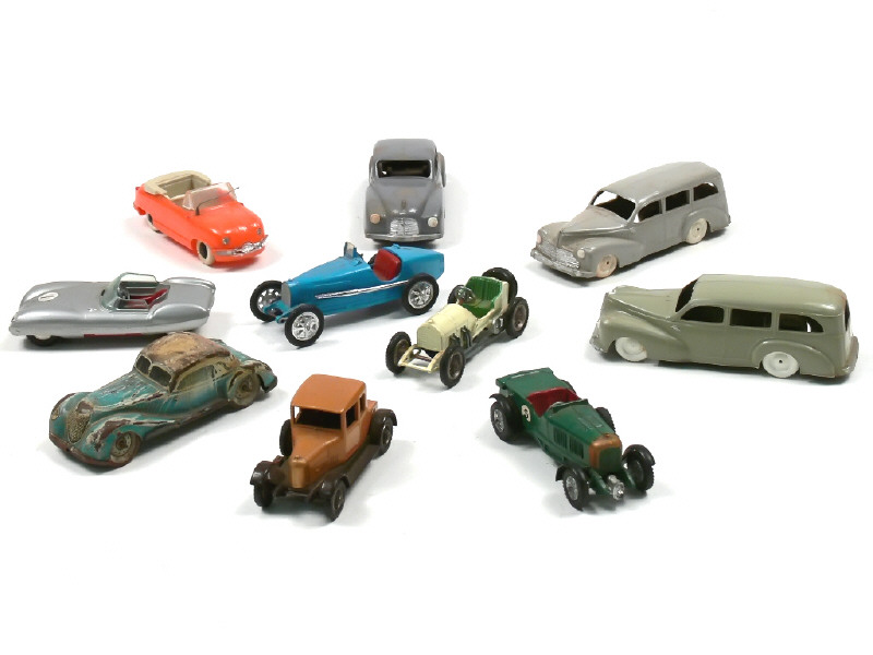 états de 'B' à 'E' - miniatures reproduisant notamment les modèles : LOTUS, PEUGEOT (2 exemplaires), PANHARD, BUGATTI, BENTLEY, MERCEDES, MORRIS & HOTCHKISS - on y retrouve notamment les marques : CLE, MINIALUXE, CORGI TOYS, MATCHBOX & JMK - petits manques - quelques carrosseries encrassées & tachées