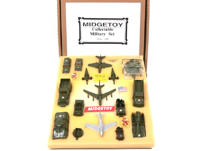 contient : 2JEEP (de tailles différentes), camion transport de troupe, HALF TRACK, voiture d'état-major, ambulance, char, automoteur (en état 'B'), 2 canons tractés, remorque, véhicule de reconnaissance, épinglette 'PILOT', 3 avions, boîte de 6 soldats, drapeau & 4 petites publicités de la marque collées sur la mousse de protection dont une signée des 2 fondateurs E.W. & A.E. HERDKLOTZ - éléments présentés ficelés - SUPERBE ENSEMBLE !