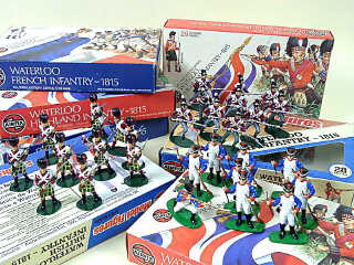 comprend : 2 boîtes d'infanterie de ligne anglaise, 3 boîtes d'écossais, 1 boîte d'infanterie de ligne française & 1 boîte de grenadiers français (chaque boîte contient entre 25 & 30 figurines peintes)