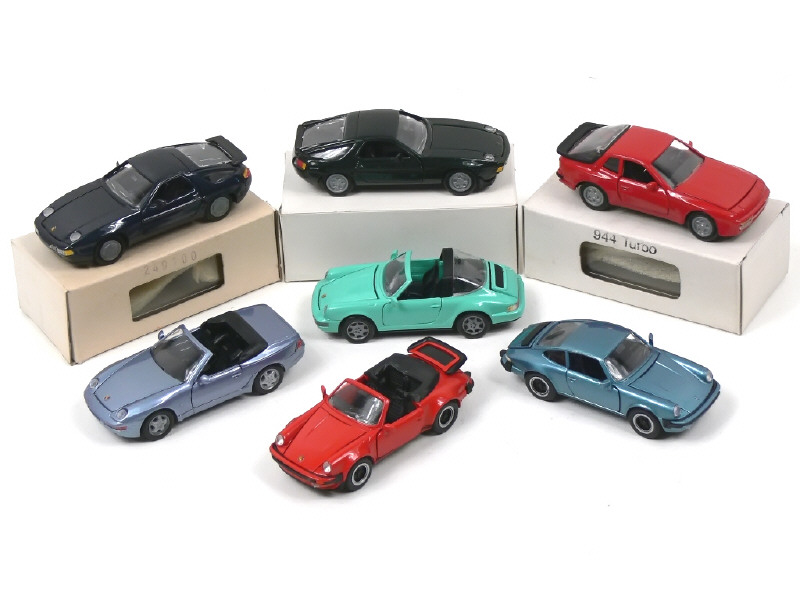 on y retrouve les modèles : CARRERA, TURBO cabriolet, 928S (2 exemplaires de couleurs différentes), 944 TURBO, C2/4 TARGA & 966 cabriolet - une surboîte en état 'c'