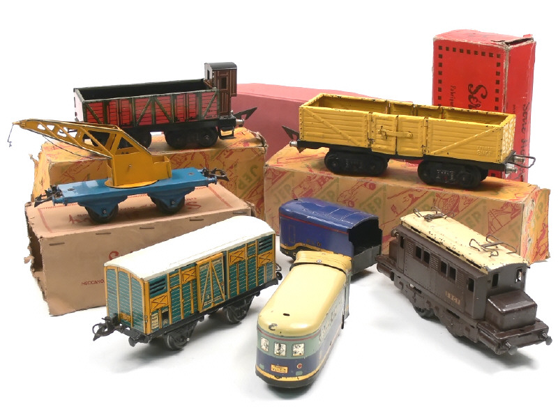 états de 'C' à 'E' - comprend : motrice type 'boîte à sel' avec moteur à clef (à revoir) & traces de métal fatigue sur 3 roues, wagon-tombereau avec vigie, wagon-tombereau avec double-portes ouvrantes, wagon-grue, wagon-fourgon à bestiaux, un élément d'autorail 'PLM' avec son soufflet & un tender 'PLM' - quelques traces d'oxydation & petits manques - 5 éléments avec boîte en état de 'c' à 'd' dont 2 non conformes - on y retrouve les marques : HORNBY & JEP