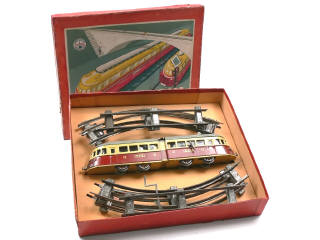 contient un autorail à 2 élément avec moteur à clef & bruiteur (fonctionnent), 6 rails courbes, 2 rails droits & cale de fond de boîte - un enfoncement sur une des faces - avec clef non d'origine - rails ternis