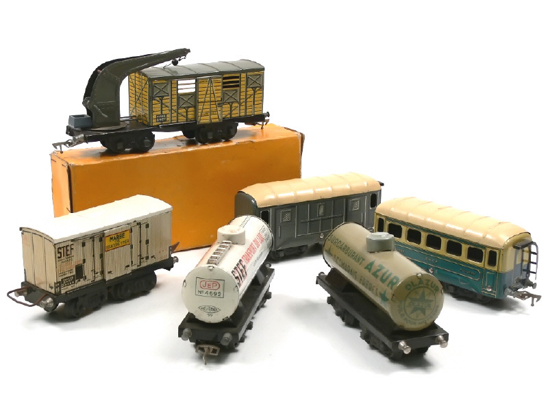 états de 'A' à 'C' - comprend : wagon de secours (avec boîte, manque une porte, quelques traces d'oxydation sur certaines parties nickelées), wagon frigorifique 'STEF' (attelages oxydés, manque les caches de boggies), wagon-citerne 'STEF' (manque un attelage), wagon-citerne 'AZUR' (manque un attelage), wagon-fourgon à bagages & voiture PULLMAN