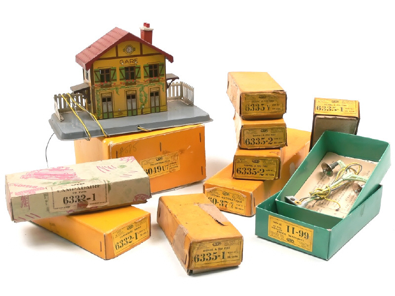 états de 'A' à 'C' - comprend : 5 signaux à feux fixes, 2 lampadaires simples, signal automatique, lampadaire double (HO), transformateur n°6049U & petite gare en tôle lithographiée - tous les éléments sont avec boîte (quelques uns avec notice) sauf la gare