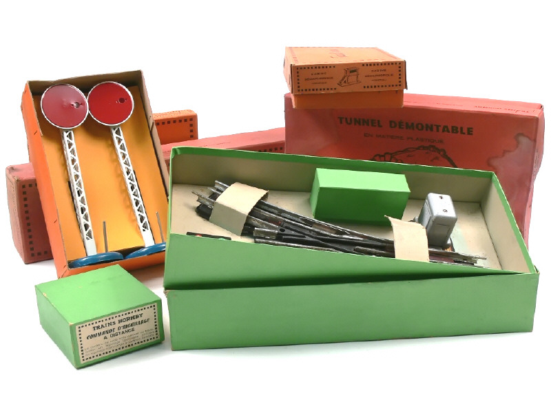 états de 'A' à 'C' - comprend : quai à marchandises démontable en bois (manque grue), tunnel démontable en plastique (manque pastilles colorées de feux), cabine sémaphorique, paire de signaux-disques, aiguillage talonnable droit & une commande d'aiguillage à distance - tous les éléments sont avec boîte