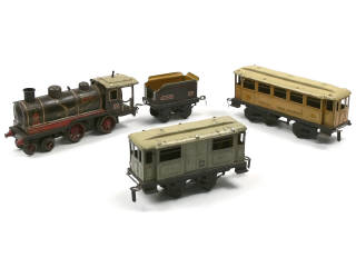 comprend : locomotive à vapeur type 220 avec tender 'ETAT' & moteur à clef (fonctionne), voiture-restaurant (manque un axe & 2 roues) & wagon-fourgon à bagages - petites traces d'oxydation
