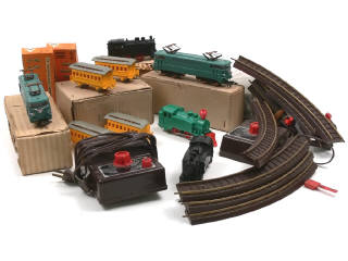 états de 'A' à 'C' - comprend : 2 motrices électriques type BB 9201, 2 locomotives à vapeur type 020, locomotive à vapeur type 020 du far west avec ses 4 voitures de voyageurs 'PENNSYLVANIA', 4 transformateurs, 2 boîtes de figurines, 2 notices, un ensemble de rails divers & un important ensemble d'accessoires de voies - 7 éléments avec boîte - quelques petits manques & traces d'oxydation