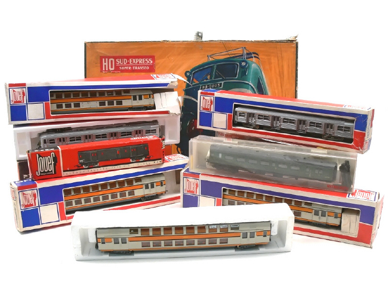états de 'A' à 'C' - comprend : motrice de banlieue avec voiture de voyageurs, 4 voitures de voyageurs à un étage, 4 voitures de voyageurs & voiture-restaurant - petits manques avec parties oxydées - on y joint un coffret vide 'SUD EXPRESS' de la marque JOUEF en état 'c' - on y retrouve les marques : JOUEF, LIMA & FLEISCHMANN