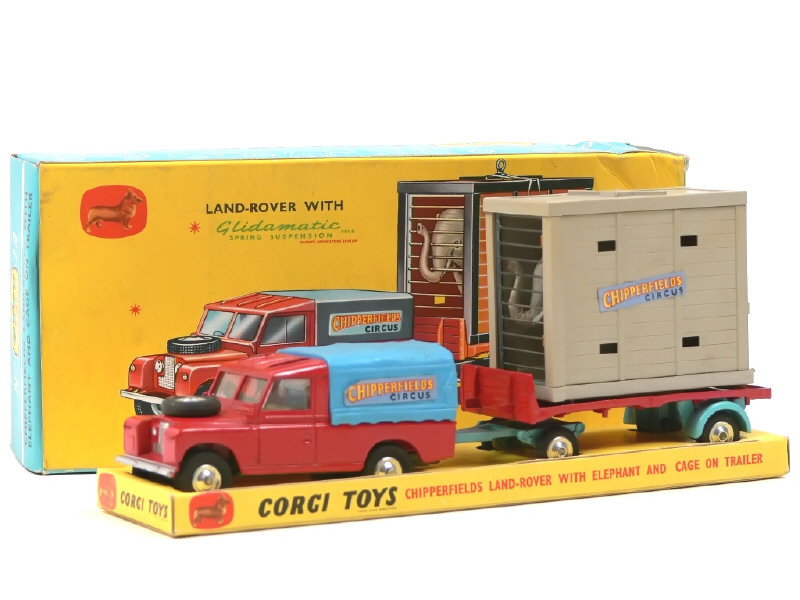 CORGI TOYS (GB) GS19 LAND ROVER Pick-up bâché 'CHIPPERFIELD' avec remorque cage à éléphant rouge & bleu